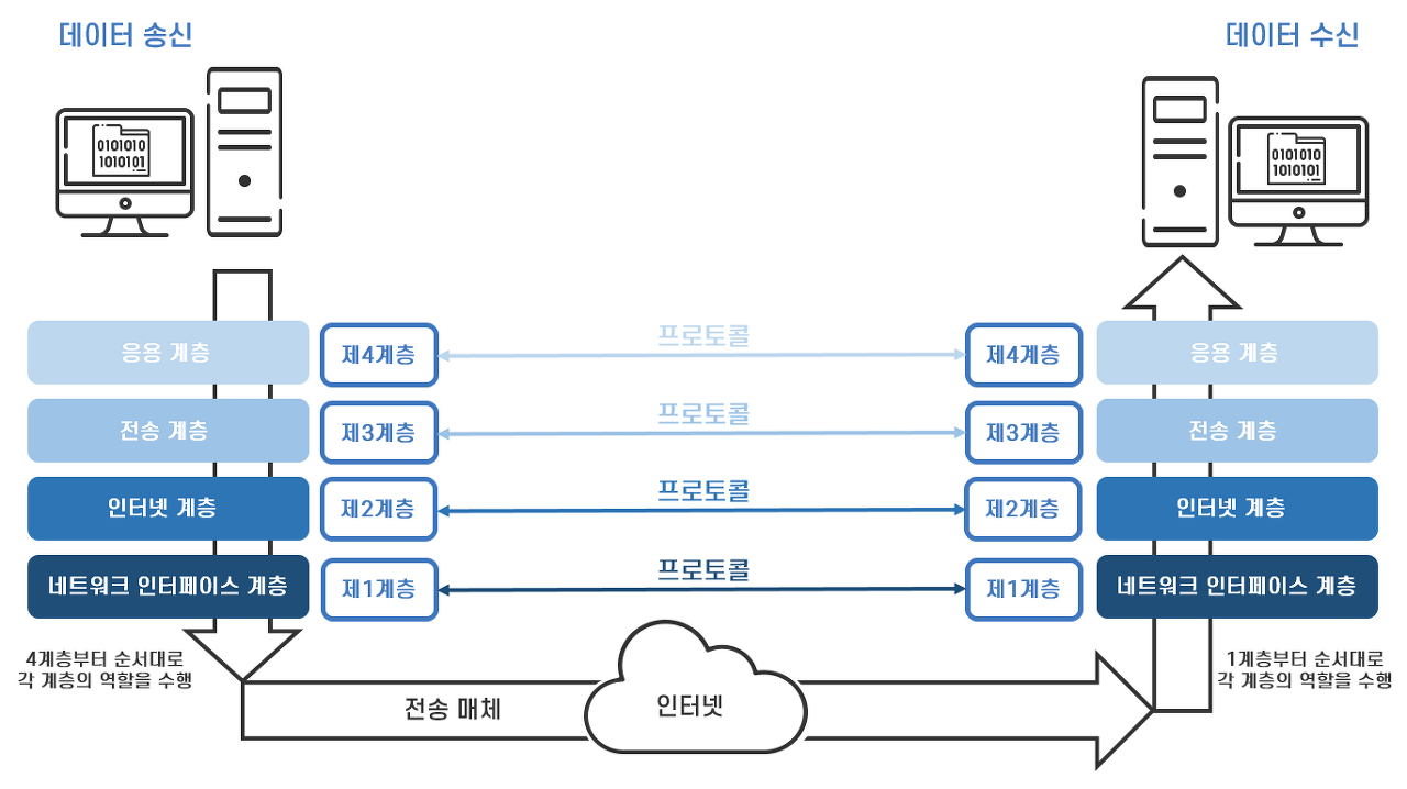 현재는 네트워크상 데이터 전송 과정을 4개의 계층(Layer)로 단순화한 TCP/IP 모델이 일반적으로 사용되고, 이것이 인터넷 표준이 되었다.