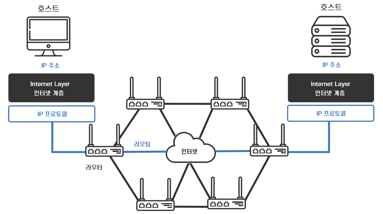 따라서 인터넷을 연결된 모든 호스트와 중간 노드인 라우터는 반드시 IP 계층의 기능을 갖고 있어야 한다.