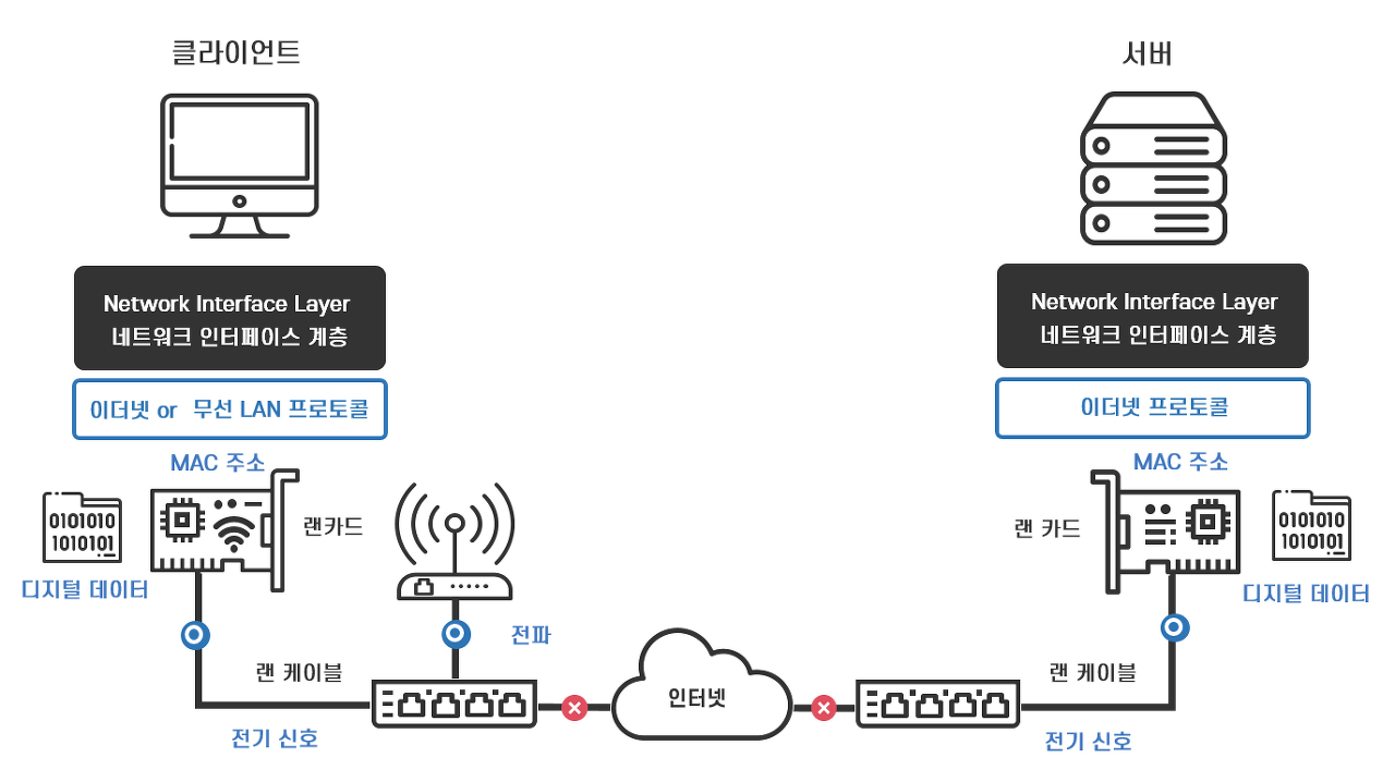 TCP/IP 모델 최하층에 위치한 네트워크 인터페이스 계층은 이름처럼 인접한 네트워크 기기 간에, 즉 전송 매체로 연결되어 전기 신호나 전파가 도달하는 범위에서 데이터를 전송하는 역할을 한다.