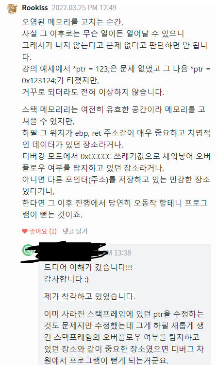 // ptr에 담긴 값을 수정할 수 있다. ( 이 자체만으로도 치명적인 문제! 하지만 디버깅에 문제없이 작동된다. )
