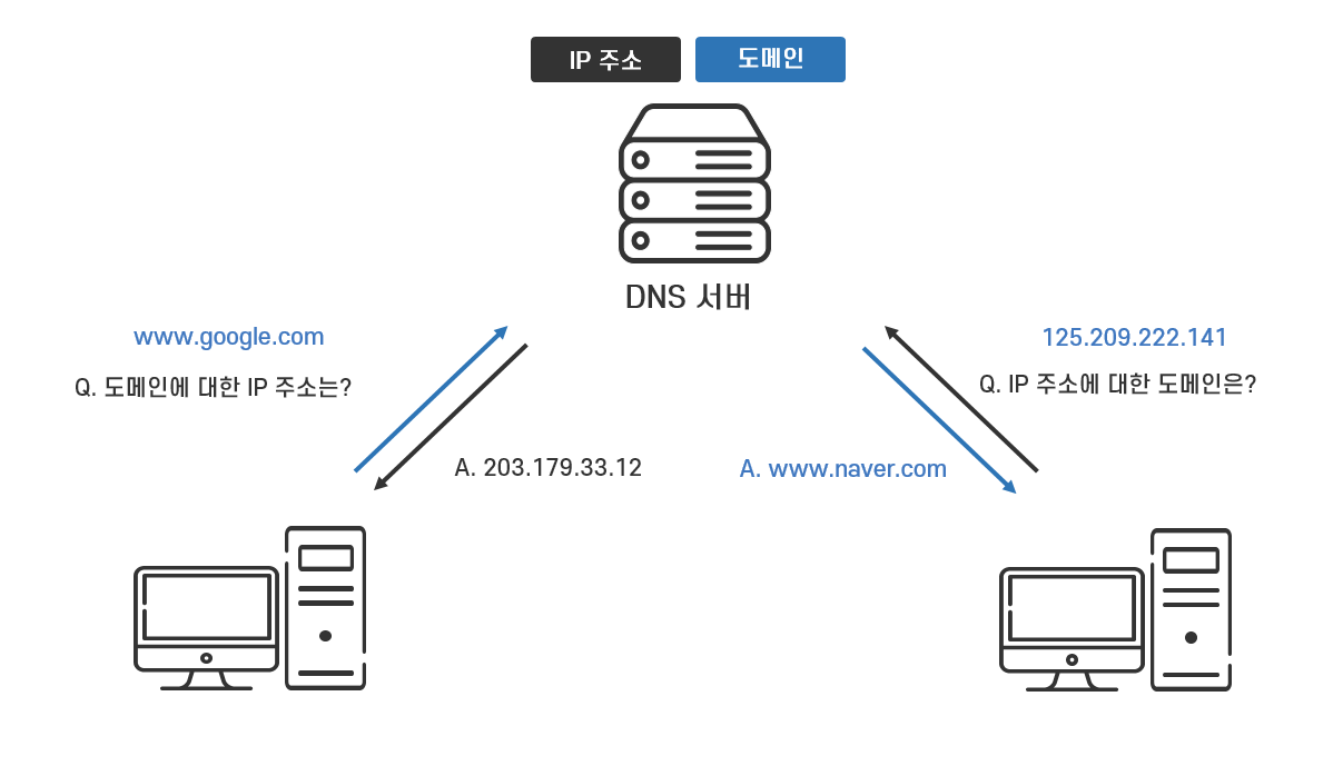 따라서 도메인에 대응하는 IP 주소를 알고 싶거나 IP 주소에 대응하는 도메인을 알고 싶으면 DNS 서버에게 물어보면 됩니다.
