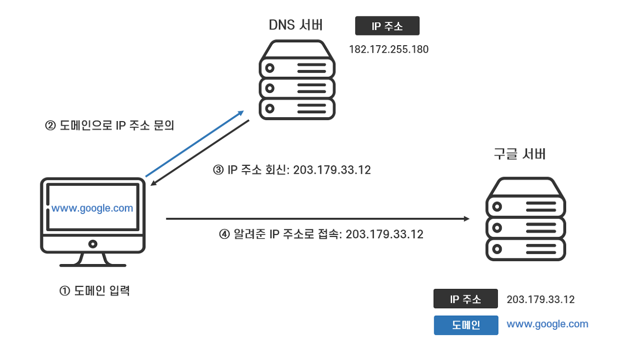 사용자가 도메인 이름 www.google.com을 입력하면 사용자의 컴퓨터는 DNS 서버에게 도메인 이름 www.google.com의 IP 주소를 문의합니다.