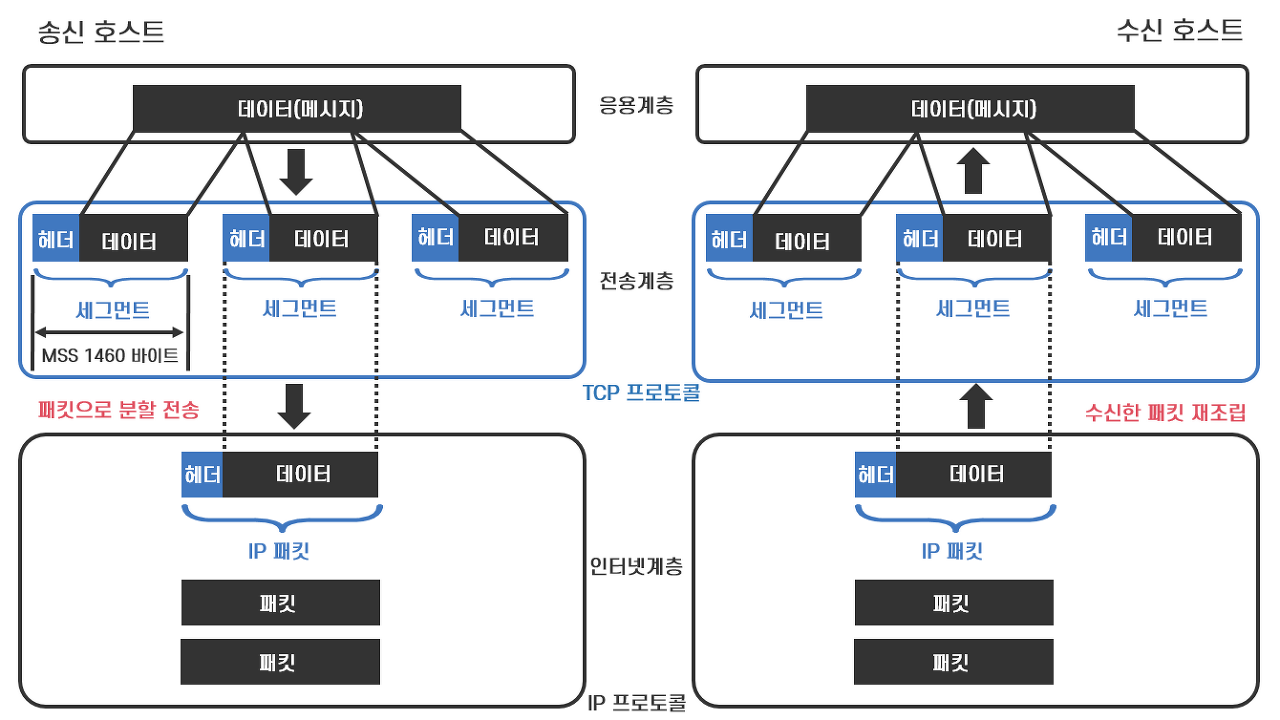 전송 계층의 TCP는 모든 패킷이 수신지에 제대로 도착했는지 확인하고 수신한 데이터의 순서를 송신한 순서대로 재설정하여 패킷들을 재조립함으로써 전체 데이터가 올바르게 전송되도록 합니다.