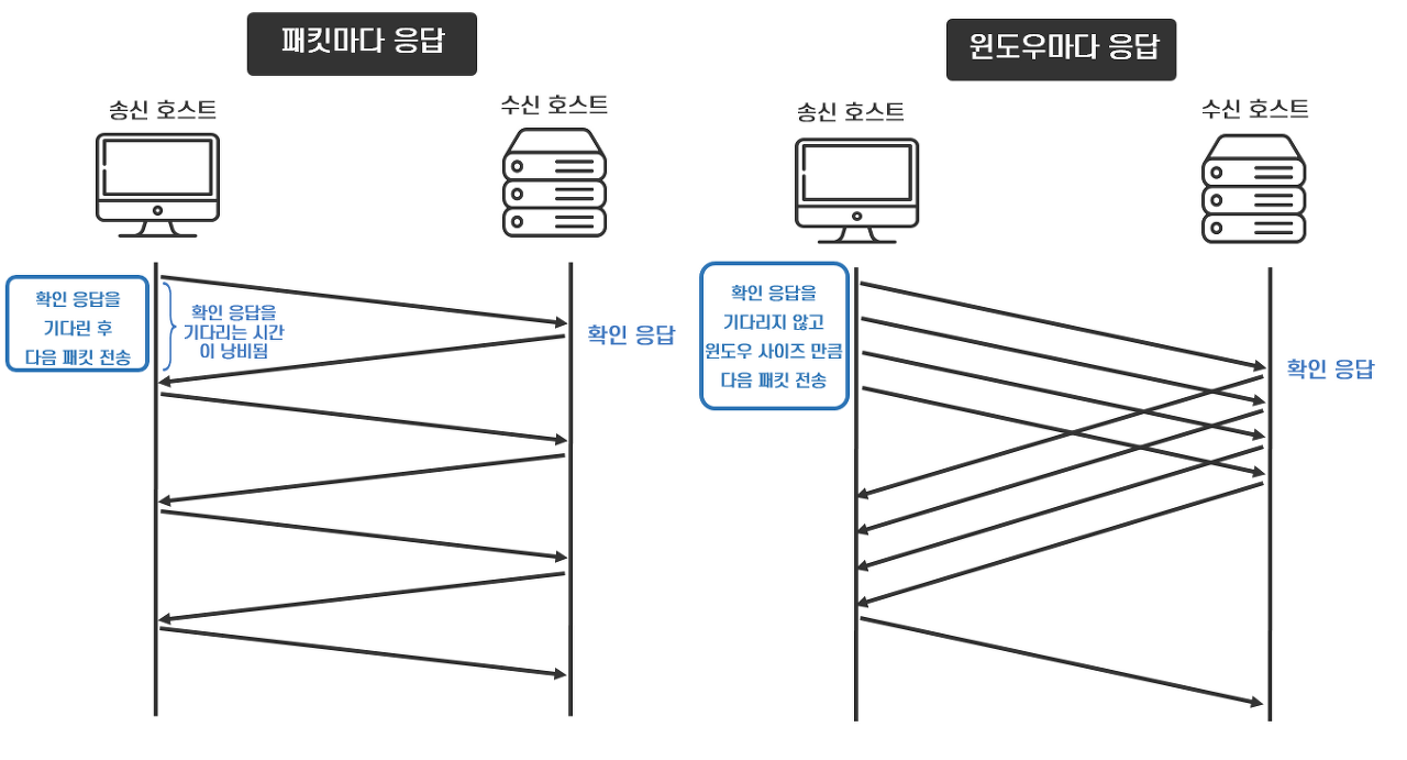 송신 호스트는 윈도우 사이즈만큼 수신 호스트의 확인 응답을 기다리지 않고 패킷을 보낼 수 있습니다.