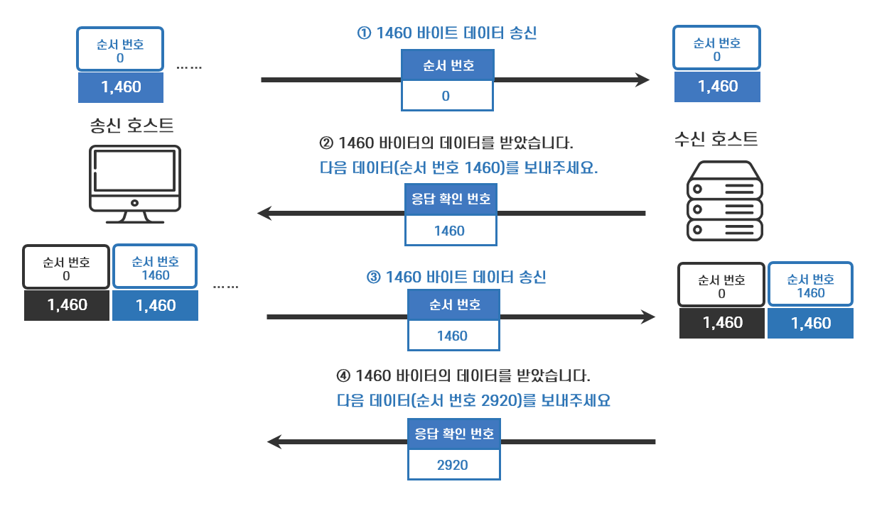 아래 그림에서 수신 호스트는 첫 번째 데이터 1460 바이트를 수신하고 다음에 수신하고자 하는 데이터의 순서 번호 1460을 확인 응답 번호에 넣어 전송합니다.
