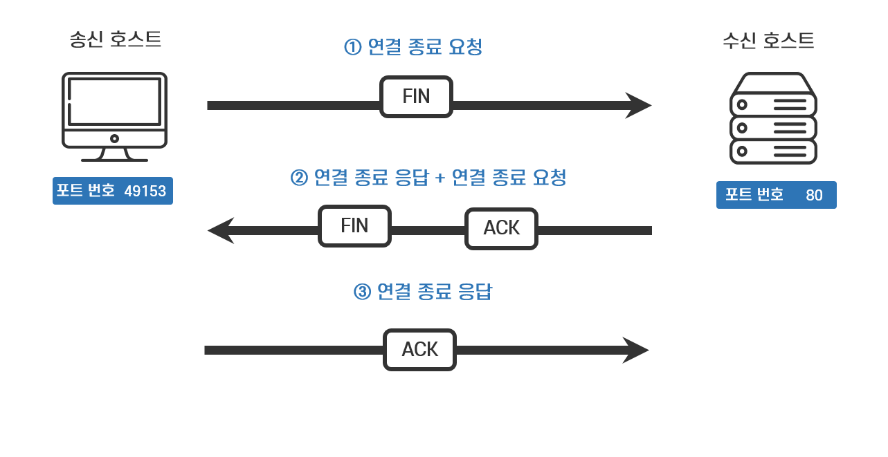 연결을 요청할 때는 SYN과 ACK라는 코드를 사용했지만, 연결을 종료할 때는 연결 종료를 뜻하는 FIN과 ACK를 사용합니다.