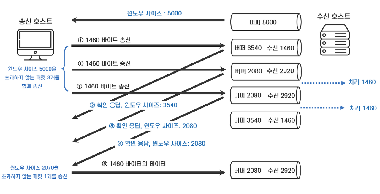 이렇게 TCP는 수신 호스트가 윈도우 크기를 변경하는 방법으로 송신 호스트에게 데이터 전송량을 지시함으로써 데이터의 흐름을 제어하고 전송 효율을 높입니다.