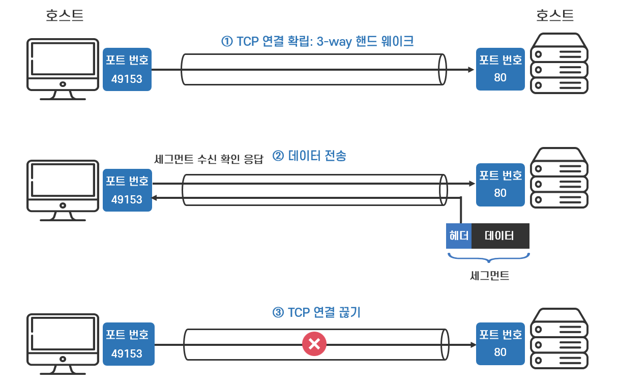 이렇게 TCP는 데이터 전송 전에 정상적인 통신이 가능한지 확인하는 과정을 거치고 통신 중에도 상대방과 계속적인 연락을 취함으로써 데이터 전송의 확실성을 높입니다.