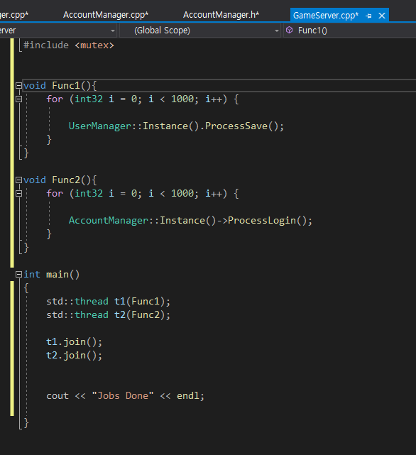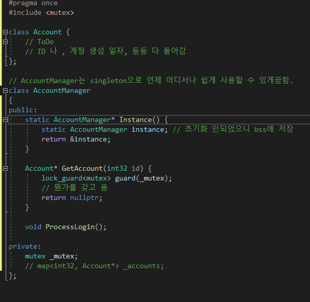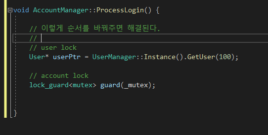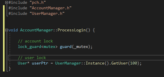 반대로 쓰레드 t2 는 ProcessLogin() 함수를 실행하면서 account lock을 걸고 있는데 마찬가지로 ProcessLogin() 함수가 끝날떄 소멸자에 의해 unlock 된다.