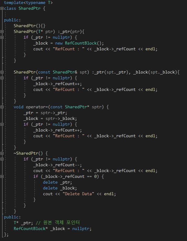 애를 nullptr로 밀어주면 간접적으로 refCount 1을 소멸시켜주는 부분이 코드에서 들어가게 된다.