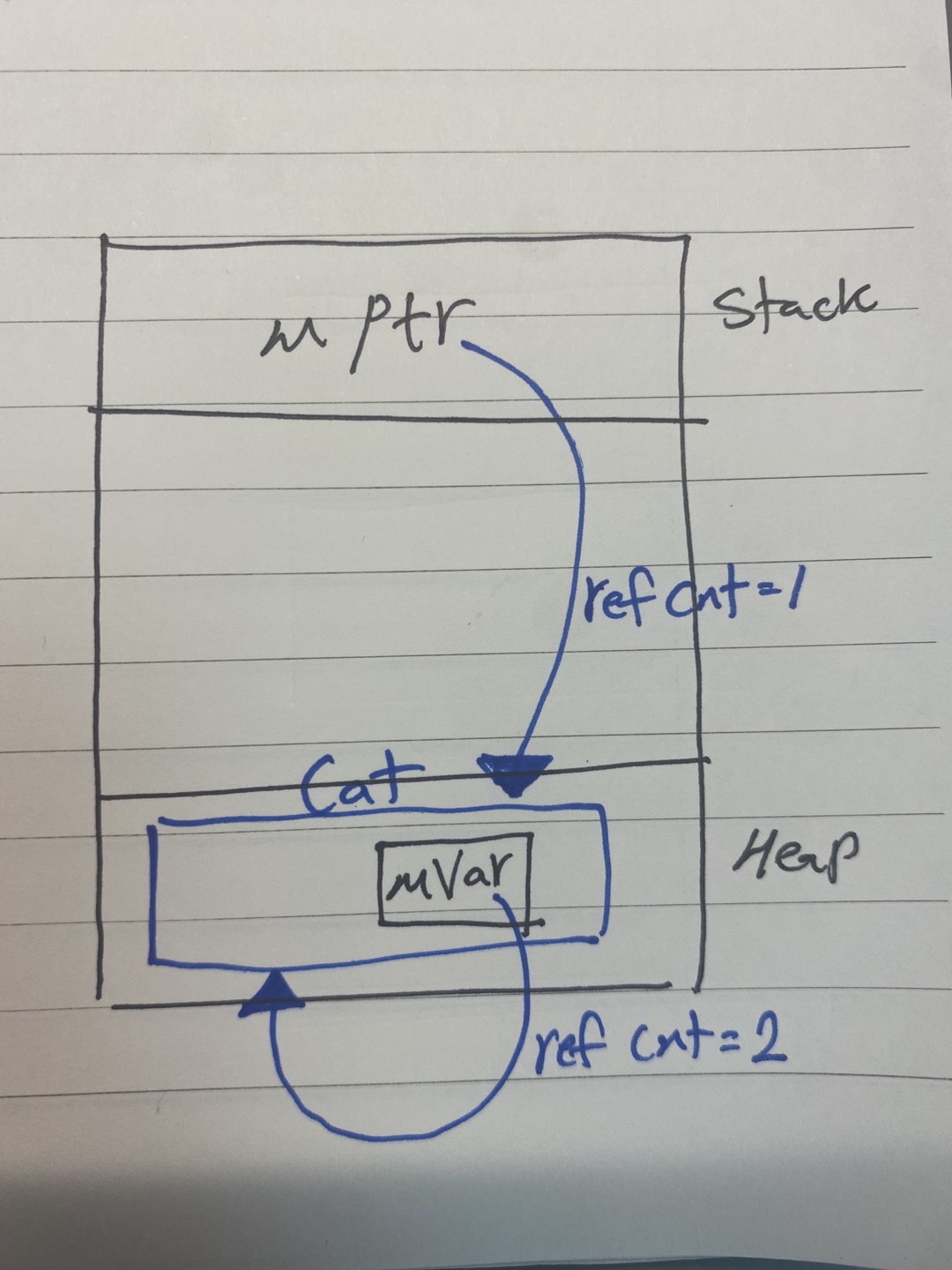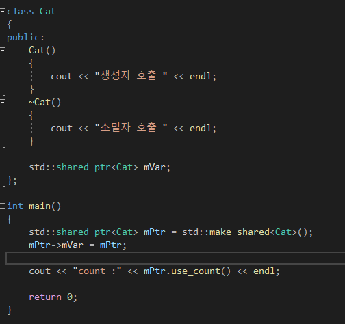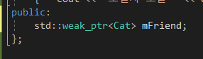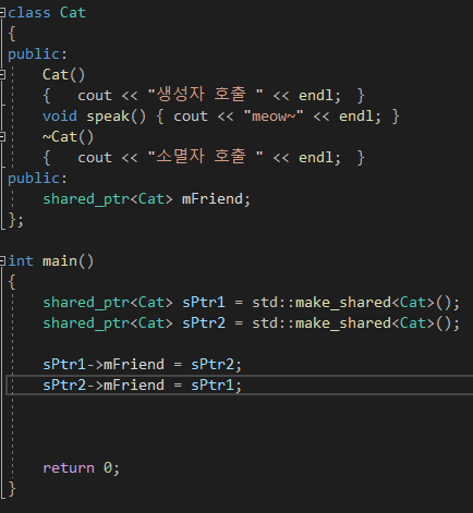 mPtr 은 Cat 클래스의 Shared_ptr인데, Cat 클래스 안에 멤버 변수로 shared_ptr 을 하나 더 가지고 있고,
