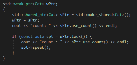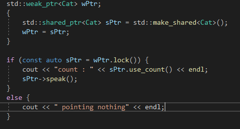 그리고 weak_ptr을 사용하기 위해서는 weak_ptr 의 lock() 함수를 이용해서