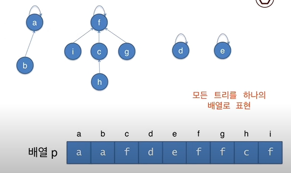 여기서 parent[10] 배열은 각 노드의 집합을 트리로 구현한 배열.