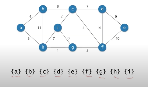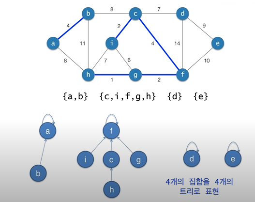 어떠한 엣지가 사이클을 형성하는지 아닌지 알기 위해 우리는 각 정점을 서로소인 집합들로 표현해야한다.
