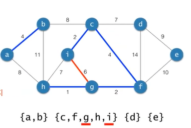엣지 ( i ,g ) 를 선택하려고 할때 g 와 i 는 같은 집합에 속해 있으므로 선택하면 사이클을 형성하게 된다.