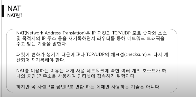 NAT 는 하나의 기술이고, 그 기술을 사설IP와 공인IP를 바꾸는데 많이 쓰인다 이다.