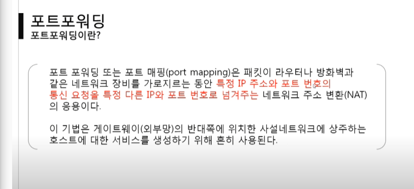 - 일반적으로 포트포워딩 설정은 네트워크 장비에서 한다.