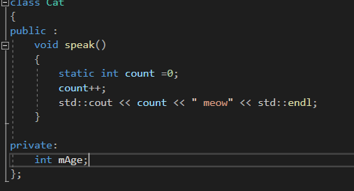 그럼 이걸 굳이 멤버 변수로 가질 필요 없이 ,speak 함수 안에 static 변수를 선언하면 접근할 수 없는 안전한 변수가 된다.