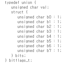구조체의 기능 중에서 많이 사용하지 않지만, 정수형 데이터를 비트 단위로 나누어서 사용할 수 있는 기능을 제공합니다. 이를 구조체의 bit field라고 합니다. struct 구조체명 { 정수형 멤버명1 :