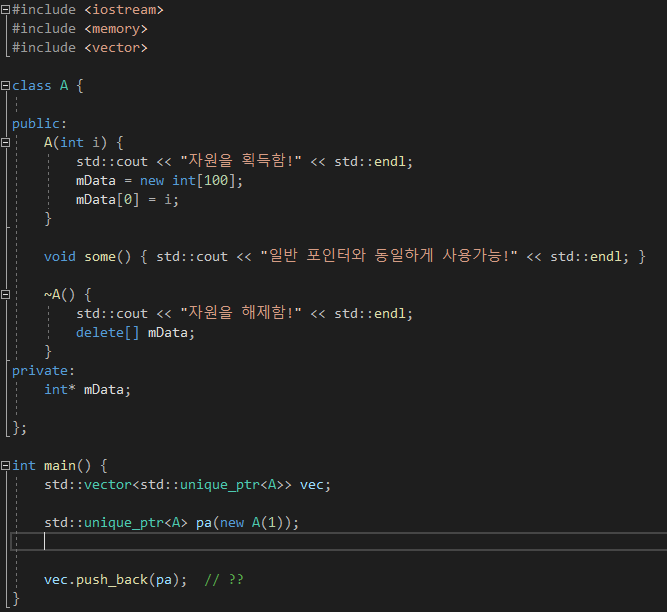 오류가 뜨는데 이는 push_back() 함수 안에서 copy-constructor를 통해 pa를 copy 해 임시객체를 만드려고 해서 그렇다.
