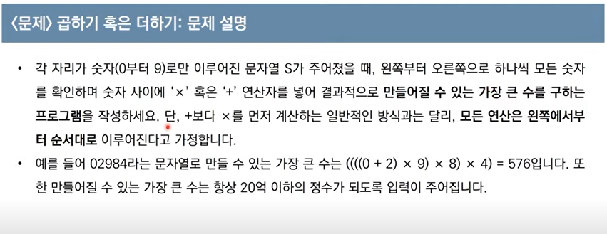 #include <bits/stdc++.h> using namespace std; string str; int main(void) { cin >> str; // 첫 번째 문자를 숫자로 변경한 값을 대입 long long result = str[0] - '0'; for (int i = 1; i < str.size(); i++) { // 두 수 중에서 하나라도 '0' 혹은 '1'인 경우, 곱하기보다는 더하기 수행 int num = str[i] - '0'; if (num <= 1 || result <= 1) { result += num; } else { result *= num; } } cout << result << '\n'; }