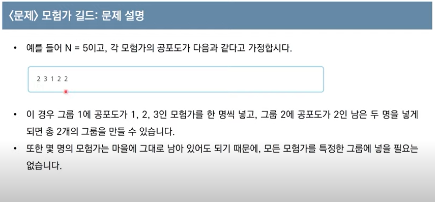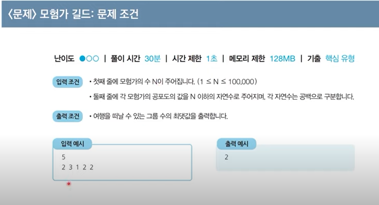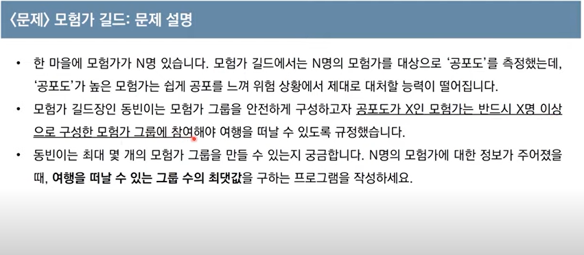 #include <bits/stdc++.h> using namespace std; int n; vector<int> arr; int main(void) { cin >> n; for (int i = 0; i < n; i++) { int x; cin >> x; arr.push_back(x); } sort(arr.begin(), arr.end()); int result = 0; // 총 그룹의 수 int count = 0; // 현재 그룹에 포함된 모험가의 수 int p = 0; for (int i = 0; i < n; i++) { // 공포도를 낮은 것부터 하나씩 확인하며 p = arr[i]; // 현재 그룹의 공포도 count += 1; // 현재 그룹에 해당 모험가를 포함시키기 if (count >= p) { // 현재 그룹에 포함된 모험가의 수가 현재의 공포도 이상이라면, 그룹 결성 result += 1; // 총 그룹의 수 증가시키기 count = 0; // 현재 그룹에 포함된 모험가의 수 초기화 } } cout << result << '\n'; // 총 그룹의 수 출력 }