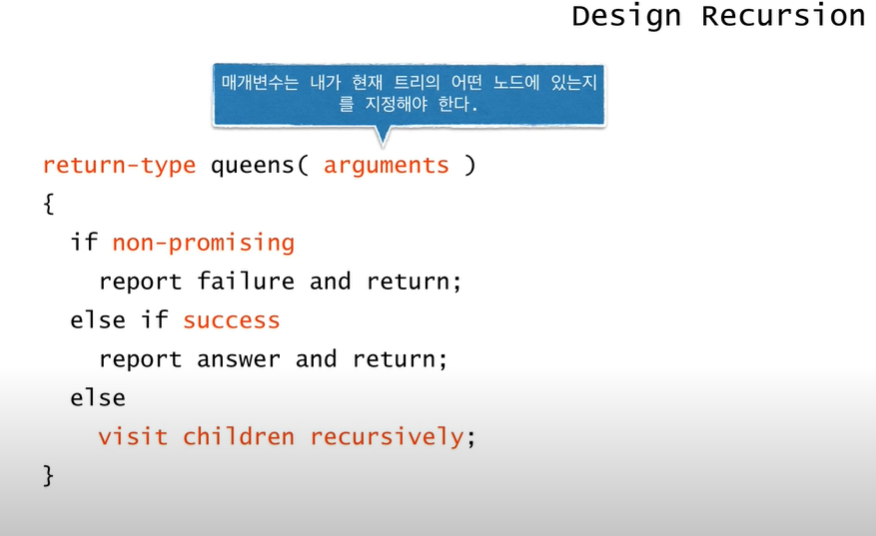 솔루션을 찾는 과정에서, 유망(promising)하지 않은 후보해에 대해 대해 빠르게 포기하고 이전 단계로 되돌아(back track)가 다른 후보해를 찾는 알고리즘 기법이다.