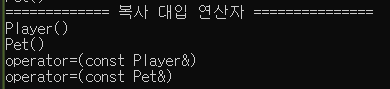 암시적으로 복사 대입 연산자가 호출 될때 아래와 같이 Player와 Pet 클래스 역시 복사 대입 연산자가 호출되는것을 볼 수 있다.