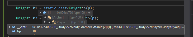 이렇게 static_cast 를 했을때에는 k1이 아래의 p의 주소를 가리키고 있고 맨 처음 값인 p의 VFT 의 주소를 가리키고 있는 상태인것을 알 수 있다. ( 잘못된 캐스팅이 일어난 경우 )