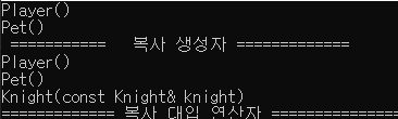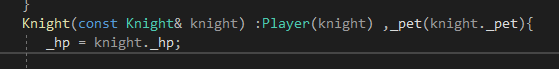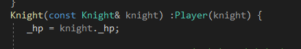 그래서 문제는 Knight 복사 생성자를 호출 할때 선처리 영역에서 Player의 기본 생성자를 호출 하는게 문제이기 때문에