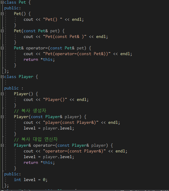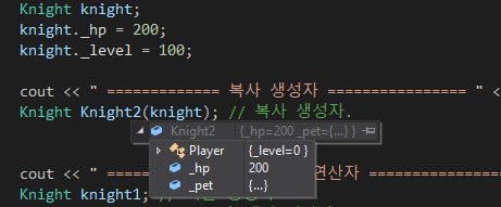 level 같은 경우 Player 의 변수 이기 때문에 Knight 의 복사 생성자에서 뭔가 작업이 이루어지기에는 무리가 있다.