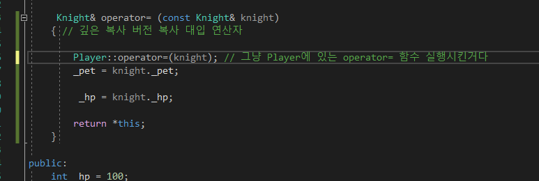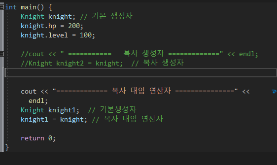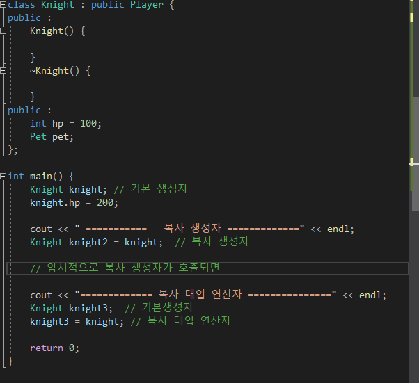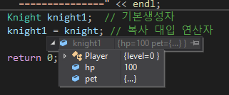 선처리 역역에서 Player() : 기본생성자 가 아닌 Player(knight) : 복사 생성자 를 호출 해 줄 수 있다.