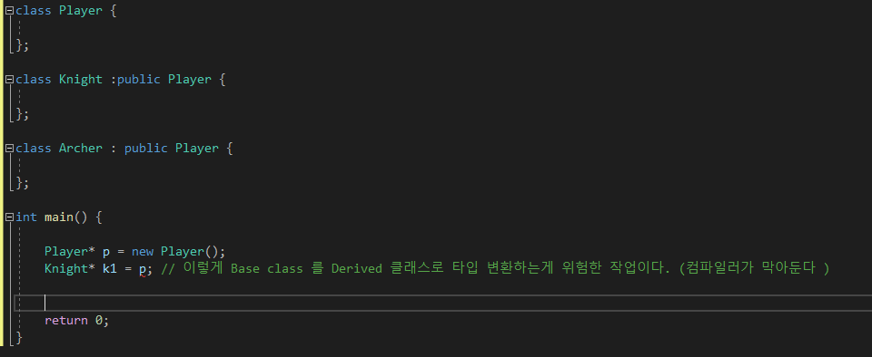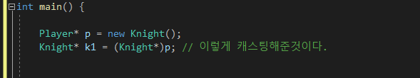 ex) Player* -> Knight* ( 다운 캐스팅 : 부모 타입에서 자식 타입으로 )
