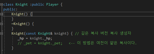 그렇다면 Knight 클래스 안에 명시적으로 복사 생성자를 넣어놓으면 어떻게 될까?
