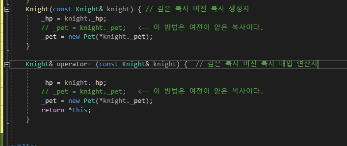 결국에는 knight1 , knight2 도 knight를 복사 했기 때문에 똑같은 pet( 같은 포인터 )을 공유하게 된다.